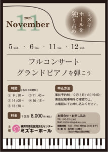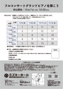 毎月恒例、ミズキーホールのホールで「フルコンサートグランドピアノを弾こう」を開催いたします。