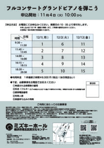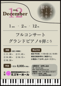 毎月恒例、ミズキーホールのホールで「フルコンサートグランドピアノを弾こう」を開催いたします。