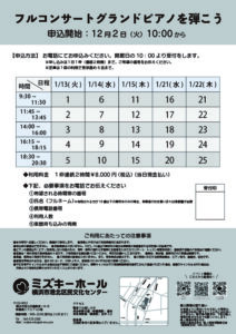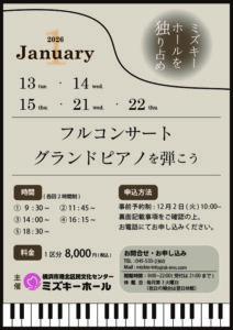 毎月恒例、ミズキーホールのホールで「フルコンサートグランドピアノを弾こう」を開催いたします。