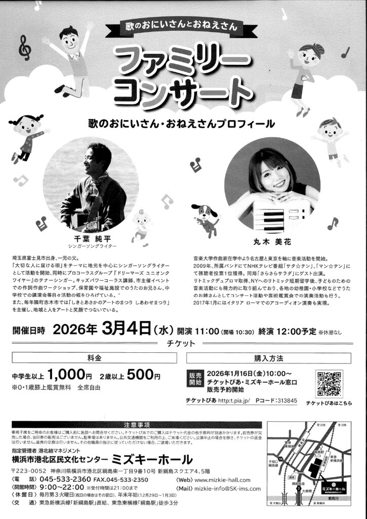 - 前売券:ミズキーホール窓口、チケットぴあ(Pコード:313845)で1/16 10:00~より発売