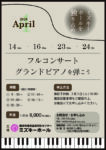 毎月恒例、ミズキーホールのホールで「フルコンサートグランドピアノを弾こう」を開催いたします。 2026年3月3日(火)10:00から 電話での受付を開始いたします。 楽器の持込が可能となりました…